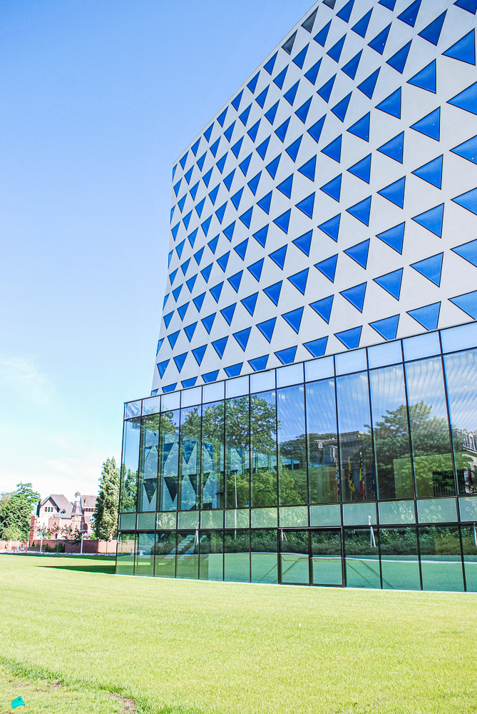 Ongewoon is de opbouw van het glasmozaïek in de geventileerde gevel van de toren. Het gebouw telt maar liefst 683 driehoekige ramen. Die driehoekige beglazing loopt uit in scherpe punten.
