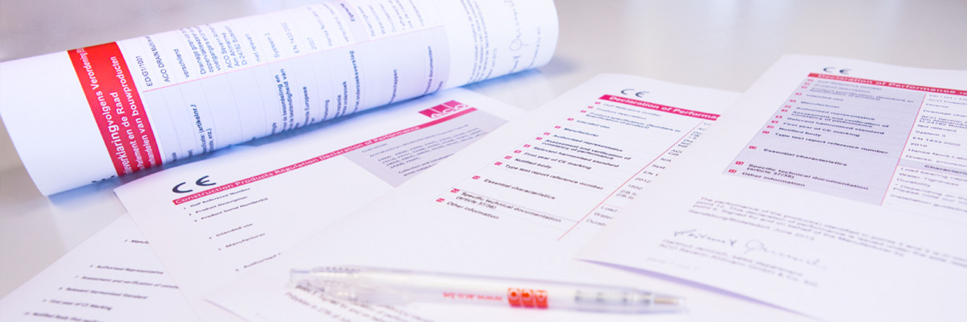 In de DoP worden ook prestaties van het product op een aantal essentiële kenmerken weergegeven. Producenten (en handelaren) moeten de DoP bij de producten meeleveren. Dit mag ook door deze digitaal ter beschikking te stellen (waarmee een papieren documentenstroom voorkomen wordt). Hieronder tref je een voorbeeld van CE-markering op ACO producten en de verwijzing naar de betreffende DoP.